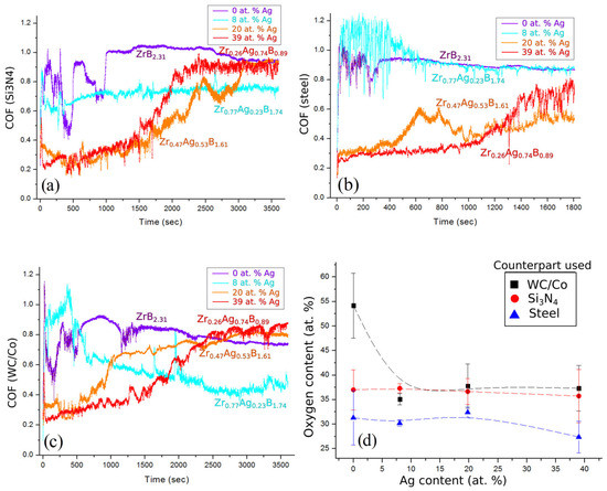 Results of dry sliding ball-on-disc tribological test for the reference ZrB2+Δ and Zr1−xAgxB2+Δ films on K100 substrate against different ball materials including (a) Si3N4, (b) steel, (c) WC/Co and (d) analysis of oxygen content in the wear track areas, where Ag content refers to content in films according to Table 2.
