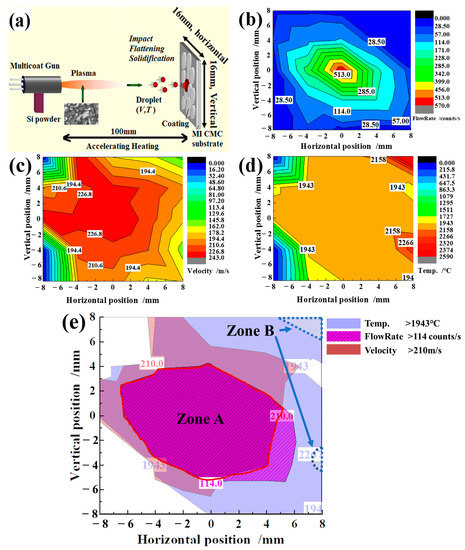 Schematic diagrams of (a) the Si layer spraying process and (b–d) the properties of inflight Si particles measured in a 16 mm × 16 mm rectangle plane, 100 mm away from the spray gun. (e) Multi-contour map with several threshold values.