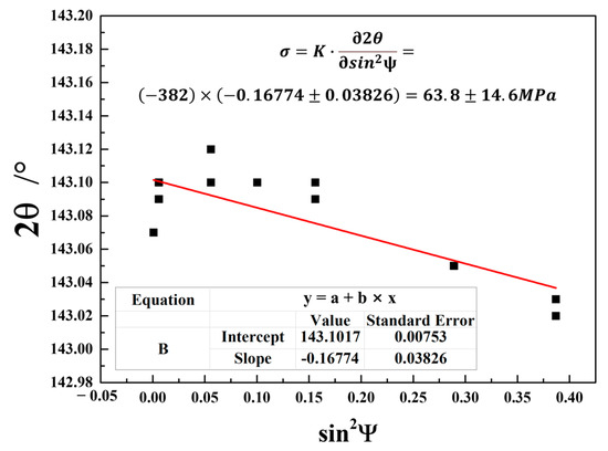 Because APS Si layers are polysilicon films, the values of = 160 GPa and = 0.22 were adopted in this study, following the study in [35]. In addition, the (422) plane with a standard interplanar spacing of 1.1086 nm was selected due to its relatively strong intensity and higher 2θ. According to the Mn Kα (λ = 0.210314 nm), = 71.5348° for the (422) plane. Finally, was calculated to be , according to Equation (7). In this study, seven couples of – were detected for all samples, and the angles included −1.54°, 4.40°, 13.66°, 18.46°, 23.27°, 32.52°, and 38.47°. XRD surface stress measurement data for the basic parameter P0 are shown in Figure 5. The data were linearly fitted using the least squares method, and the stress was calculated to be 63.8 ± 14.6 MPa. When the residual stress is tensile for thermal-sprayed coatings, there is a stress perpendicular to the coating interface whose direction is away from the substrate; therefore, coating adhesion is poor. Once the tensile stress exceeds the interface bonding, the coating peels off. For this reason, it is necessary to reduce the tensile stress or adjust the compressive stress through parameter adjustment or after treatment.