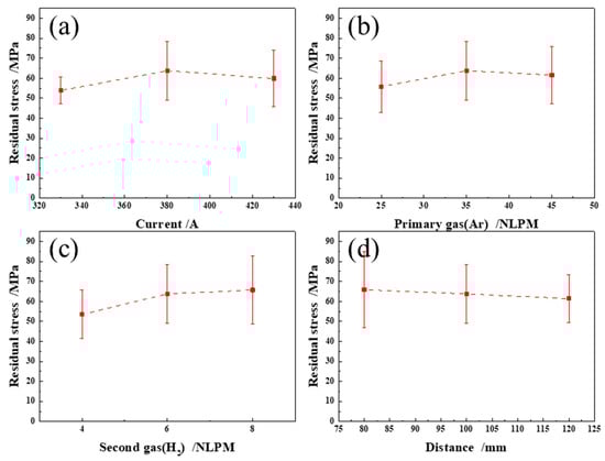 Residual stress variation with differences in (a) current, (b) primary gas, (c) second gas, and (d) spraying distance.