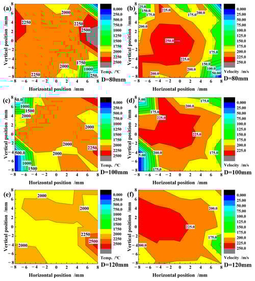 Distribution of temperatures and velocities with different spraying distances: (a,b) 80 mm; (c,d) 100 mm; (e,f) 120 mm.