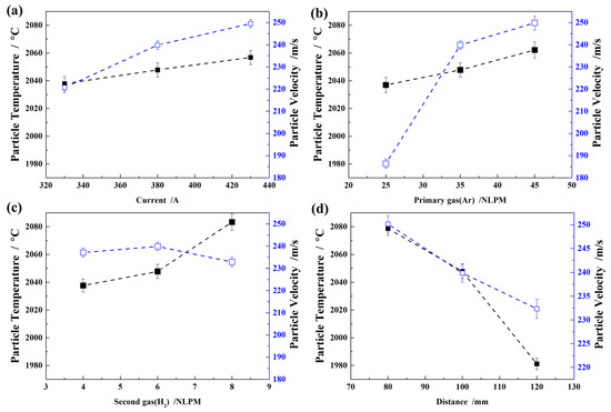 Temperature and velocity variations with differences in (a) current, (b) primary gas, (c) second gas, and (d) spraying distance.