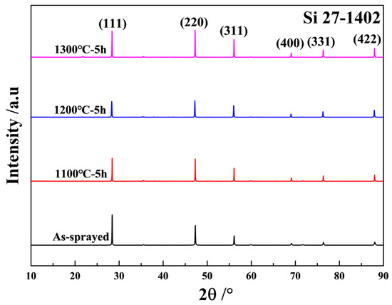 Figure 10 shows the XRD measurements of the as-sprayed and annealed silicon coatings. The results indicated that the deposited layers were cubic polysilicon, and no phase change occurred during the annealing process at a temperature up to 1300 °C. It can be seen that the intensity of the (400), (331), and (422) diffraction peaks increased significantly after annealing, compared to those of the as-sprayed Si layers. The enhancement in diffraction peaks may contribute to the changes in residual stress.