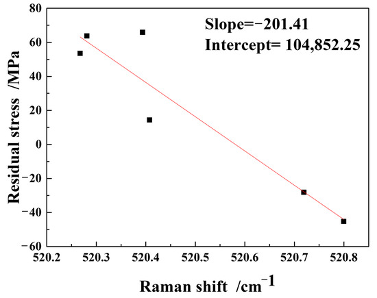 Six typical coatings were selected to test the residual surface stress via a combination of X-ray diffraction and Raman spectroscopy, as shown in Table 5. Figure 11 shows the residual stress–Raman shift results, with linear fitting according to the least squares method. Using Equation (5), the Raman shift–stress coefficient () and the Raman shift with free stress () were calculated as −201.41 MPa/cm−1 and 520.591 cm−1, respectively. The residual stress in the APS Si layer cross-section was then calculated using Equation (8):