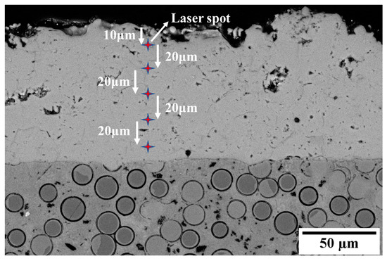 Figure 12 shows cross-sectional BSE-SEM images of the as-sprayed silicon layer. Using the APS process, a uniform and complete silicon coating on the SiC-CMCs was obtained, with some randomly distributed pores. No apparent defects at the coating/substrate interface were observed. The Raman test and stress calculation, as well as the determination of the coating thickness (shown in Figure 12) of the as-sprayed and heat-treated coatings, were carried out in this study according to Equation (8), and the results are shown in Figure 13.