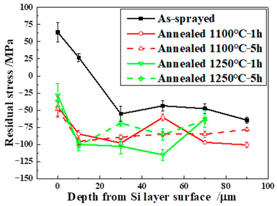 Additionally, residual stress distribution was evaluated in the cross-section of the Si layer annealed at 1100 and 1250 °C, as shown in Figure 13. The surface and interior of the coating both exhibited compressive stress after heat treatment, with the stress values lowest near the coating surface. Compared with the as-sprayed layer, the compressive stress in the coating increased more considerably, but there was no obvious difference between 1100 and 1250 °C. Furthermore, the high-temperature treatment reduced the stress difference between the surface and the interior of the APS silicon layers, resulting in uniform residual stress throughout the coating area.
