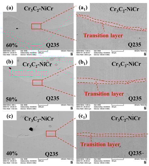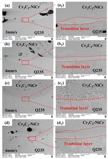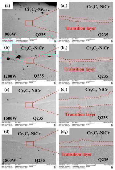 - The optimal laser power, scanning speed, and overlap rate of the Cr3C2-NiCr/Q235 steel were 1500 W, 6 mm/s, and 40%, respectively. These parameters had the interface with adequate metallurgical bonding.
