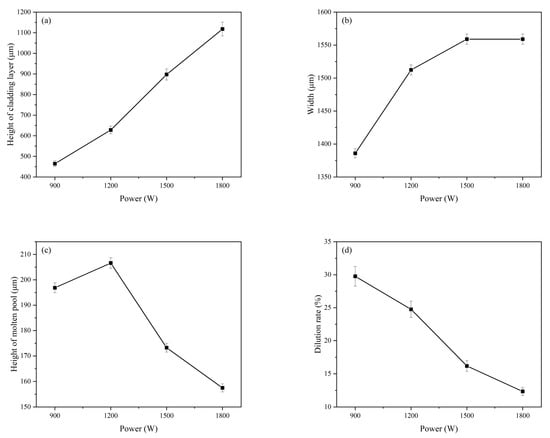 - The thickness of the interfacial layer increased and the interface smoothness improved with the increase in the laser power. The maximum thickness of the transition layer was about 50 μm for the 1500 W sample. The maximum thickness of the transition layer was about 50 μm for the 6 mm/s sample, and the weld heat affected zone was smaller and it was proven that the productivity can be effectively improved. The sample with a 40% overlap rate exhibited the best flatness.