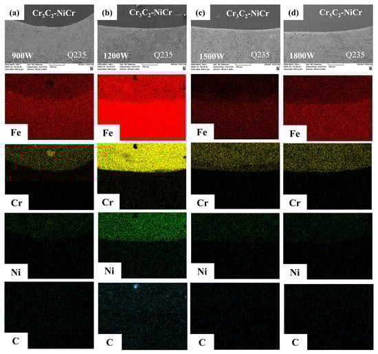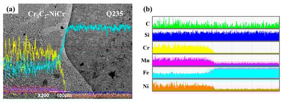 - Fe, Cr, and Ni were diffused distinctly between the cladding layer and the matrix. There was an obvious transition layer at the interface of the Cr3C2-NiCr cladding layer and Q235 steel, indicating that the Cr3C2-NiCr cladding layer had an adequate metallurgical bond with the matrix.