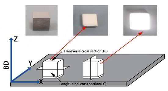 The specimen size was 10 × 10 × 10 mm3. The printing process and shape of the CoCr alloys and the Al2O3/CoCr metal matrix composite samples are shown in Figure 3. SLM manufacturing Al2O3/CoCr metal matrix composite forming process parameters were as follows: P = 200 W, V = 700 mm/s, h = 0.06 mm, and d = 0.03 mm.