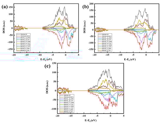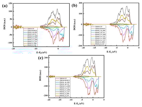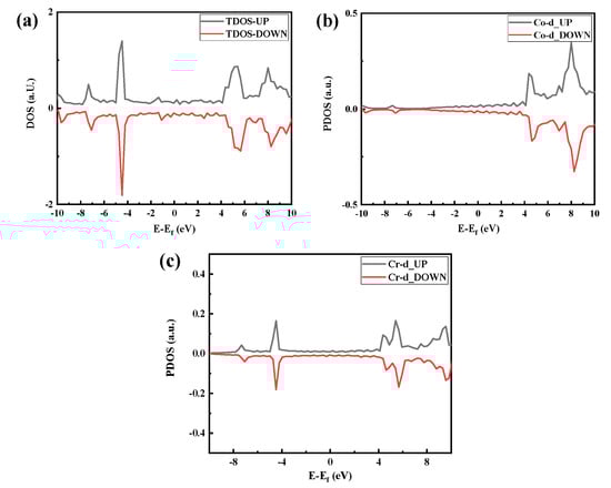 The density of states (DOS) of the optimized CoCr crystal structure is shown in Figure 5. As shown in Figure 5a, the body-phase CoCr DOS has an asymmetric distribution, indicating that the body-phase CoCr is magnetic. Therefore, Figure 5a–c have both spin-up and spin-down parts.
