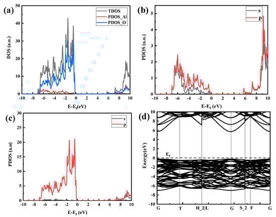 The electronic configuration of O is 1s22s22p4, and the electronic configuration of Al is [He] 3s2 3p1. Figure 8 shows the DOS and band structure of the α-Al2O3 crystal structure. Figure 8a is the total density of states of the system. It can be seen that the density of states near the Fermi level is not zero, indicating that the system has a certain conductivity, and the conduction band’s bottom and the valence band’s top overlap. According to the correspondence between the density of states and the band structure, the density of states of the lower-energy part of Figure 8a–c (−7 eV~−0.1 eV) corresponds to the low-energy band of Figure 8d, and the density of the high-energy part (6 eV~10 eV) of Figure 8a–c is produced by the high-energy band of Figure 8d, where the sharp density peak is relatively flat and the delocalization is stronger. Figure 8b represents the split-wave electron densities of the 3s and 3p orbitals of Al. Figure 8c shows the electron density of split wave states at 2s and 2p orbitals of O. The density of states in the low-energy part corresponds to the bonded molecule orbits of most electronegative atoms, namely, O atoms. It can be seen from Figure 8c that the density of states of O2s electron orbitals contributes the most in the low-energy part. For the density of states at high energies, the opposite is true, which is mainly because of the atomic orbitals of Al atoms. Comparing (b) and (c) in Figure 8, it can be seen that the density of states exhibits a “resonance” phenomenon, indicating that they have been bonded.