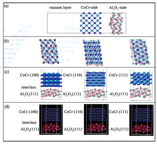 Al2O3 is not consistent with the lattice constant of the CoCr surface protocell model, directly preventing the construction of the interface model. In order to meet the periodic boundary conditions and the lattice coherence relationship, suitable crystal cells in the Al2O3 and CoCr surface atomic supercell model (Figure 10a) were found to construct the interface model (Figure 10b). According to the convergence test results, the surface structure of the Al2O3(111)’s seventh layer, the surface structure of the CoCr (100)’s eighth layer, the surface structure of the CoCr (110)’s seventh layer, and the surface structure of the CoCr (111)’s sixth layer, we built the Al2O3(111)/CoCr (100), Al2O3 (111)/CoCr (110), and Al2O3 (111)/CoCr (111) interface models (Figure 10b–d), and we built a vacuum layer of 15 Å above the models to prevent their interaction.