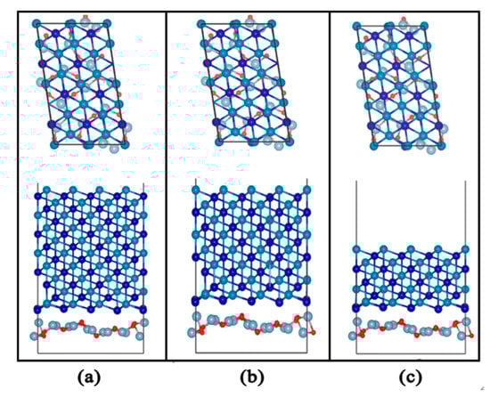 In this study, three interface models of Al2O3 (111)/CoCr (100)/CoCr (111), Al2O3(111), and Al2O3 (111)/CoCr (111) (shown in Figure 10) were constructed. The degree of lattice mismatch of the interface was calculated based on the lattice constants of the experimental study based on Equation (3), and the results can be found in Table 7. When modeling, the interface mismatch constituted by the selected two-body phase is required to be as small as possible, and it is generally considered to constitute a stable interface [30] within 8%. As can be seen from Table 7, among the three interface models constructed, the Al2O3 (111)/CoCr (111) interface structure has the minimum lattice mismatch, only 7.41%, indicating that the Al2O3 (111)/CoCr (111) interface structure is the best of the three interface structures, with the least interface tension, and Al2O3 and CoCr have the best mutual wetting performance. A preliminary analysis showed that the Al2O3 (111)/CoCr (111) interface structure is the most likely to contain heterogeneous nuclei.