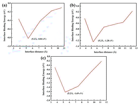 It can be seen from Figure 11c,d that the interface is mainly combined by the Co–O connection interface. The Co–O key length is 1.936 Å at the Al2O3 (111)/CoCr (100) interface, the Co–O key length is 2.016 Å at the Al2O3 (111)/CoCr (110) interface, and the Co–O key length at the Al2O3 (111)/CoCr (111) interface is 1.782 Å. It can be inferred from the key length that the strongest bond cooperation is between the Co and O atoms on the Al2O3 (111)/CoCr (111) interface, and the interface-binding mode is more conducive to the combination of the two phases; however, the final evaluation of the interface binding ability still requires comprehensive interface binding work and separation work.