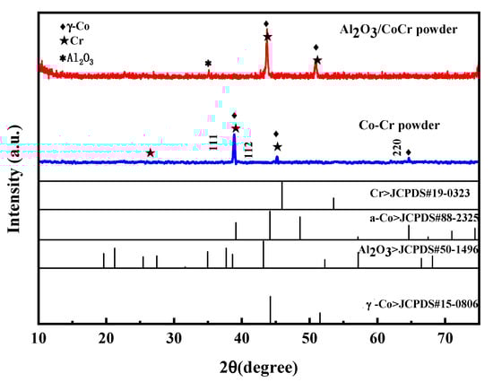 Figure 20 shows the XRD spectra of the CoCr alloy powder and the Al2O3/CoCr composite powder. In the figure, the main peak of the CoCr alloy powder appears between 38 and 39; the main phase composition is the a-Co phase of FCC, and the corresponding crystal surface indices are γ (111), γ (112), and γ (220); and the crystal cell parameter is a = 0.35340 nm, which matches the standard cell parameter a = 0.35447 ± 0.0002 (ICDD card number 15-806). The main crystal phase was basically unchanged after the addition of 5% Al2O3, but the Al2O3 phase appeared. Compared with the PDF standard card of Al2O3, Co, and Cr, the diffraction peak shifted to a high angle, the main peak appeared between 40 and 42, and the main peak shifted to the right. This is because the CoCr alloy powder was added to an appropriate amount of Al2O3 fine powder smaller than its atomic radius; in the powder-making process, these fine powders made the particle size of the mixed powder smaller overall.