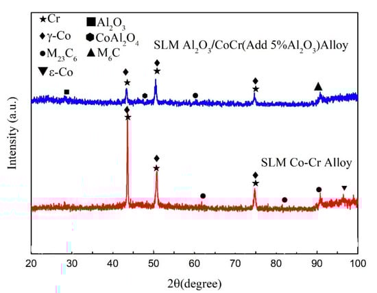 Figure 21 shows the XRD results of the pure CoCr alloy formed by SLM and Al2O3/CoCr metal matrix composites. As shown in the figure, the sample of CoCr alloy is composed of a-Co (FCC, a = 0.35447 nm, ICDD card number 15-806), ε-Co (HCP, a = 0.25031 nm, c = 0.40605 nm, ICDD card number 5-727), and carbide M23C6. After Al2O3 was added, the alloy phases were a-Co, ε-Co, M23C6, M6C, Al2O3, and CoAl2O4. Unlike with the CoCr alloy, the Al2O3, CoAl2O4, and M6C phases appear. As shown in Figure 21, the diffraction peak of the a-Co in the Al2O3/CoCr metal matrix composite is significantly higher than that of the CoCr alloy. According to Scherrer’s formula [36], the larger the half-height and width of the measured diffraction peak, the smaller the grain. Al2O3 ceramic particles can obviously refine the grain of composites.