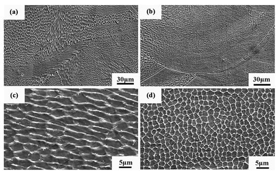 Figure 23 shows the SEM diagram of the sample. It can be seen from Figure 23a,b that the Al2O3/CoCr metal matrix composite has less grain orientation at the molten pool boundary, and further analysis shows that the cell-like grain structure at the molten pool boundary is also finer, as shown in Figure 23c,d, indicating that the alloy has a finer grain size after alumina is added.