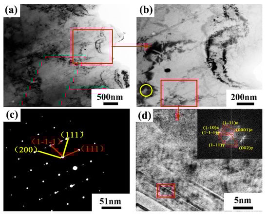 TEM bright field image and electron diffraction pattern of Al2O3/CoCr metal matrix composite: (a) bright field image of the composite material, (b) local magnified bright field image of the composite, (c) electron diffraction pattern in the yellow circle area in (b), and (d) magnified bright-field image of the lamellar area.