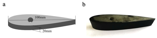 A NACA0018 airfoil glass fiber-reinforced plastic blade (GFRP blade) with a chord length of 100 mm and a span height of 20 mm was selected as a test piece. The blade model schematic and physical diagram are shown in Figure 1. The GFRP blade was ultrasonically cleaned with anhydrous ethanol ultrasonic for 10 min, rinsed with deionized water, and allowed to dry. Meanwhile, the PDMS precursor was mixed with the PDMS curing agent at a ratio of 10:1 to obtain the PDMS adhesive [24,25]. Subsequently, 1 g of the PDMS mixture was added to 50 mL of n-hexane while stirring at room temperature for 10 min. An equivalent mass of MoS2/ZnO nanomaterials was added and stirred for 30 min to form a uniformly mixed suspension, which was then evenly sprayed on the blade surface using a spray gun held 15 cm away from the blade. The GFRP blade was then cured in an oven at 60 °C for 12 h to obtain the MoS2/ZnO/PDMS nanomaterial superhydrophobic coated blade. The MoS2/PDMS nano-coating was prepared via a similar process.