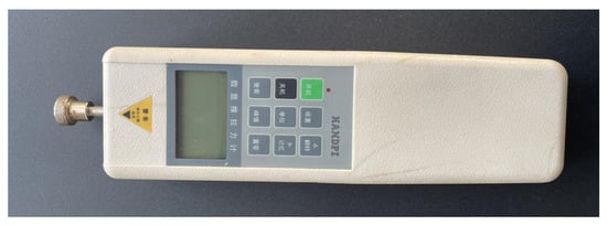 Ice adhesion strength test: A bottomless cylindrical ice sample with a bottom diameter of 25 mm and a height of 20 mm was filled with deionized water and frozen at −20 °C for 12 h. The frozen icicle was pushed with a digital dynamometer (Figure 2), and the maximum force ( in N) required to detach the icicle from the coating surface was recorded to calculate the adhesion strength of the ice using the following formula [26]:
