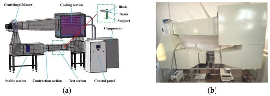 Icing wind tunnel test system (a) schematic diagram and (b) photo.