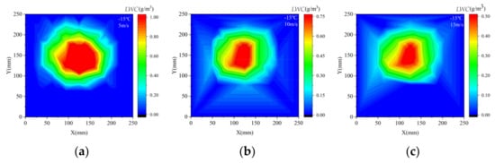 The calibration results of LWC. (a) 5 m/s, (b) 10 m/s, (c) 15 m/s.