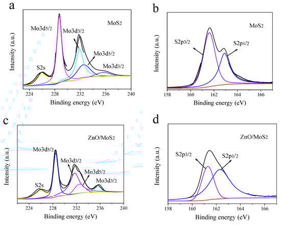 To determine the surface chemical composition and valence state of the MoS2/ZnO nanomaterials, the MoS2 nanomaterials and MoS2/ZnO nanomaterials were analyzed using XPS. A high-resolution XPS diagram of the Mo3d orbital of the MoS2 nanosheets is shown in Figure 5a. Two peaks were obtained at 231.9 eV and 228.7 eV in the Mo3d orbital of the MoS2 nanosheets, which corresponded to Mo4+. A high-resolution XPS diagram of the Mo3d orbital of the MoS2/ZnO nanomaterials is shown in Figure 5c. The XPS results show that after the growth of ZnO nanoparticles, compared with pure MoS2 nanosheets, the two peaks of Mo4+ shifted to a higher binding energy of about 0.3 eV, indicating electron transfer from MoS2 to ZnO and proving the successful synthesis of the MoS2/ZnO nanomaterials. The results also show two peaks at 235.6 eV and 232.5 eV, corresponding to Mo6+, which suggests that there was oxidation of the surface of the MoS2 nanosheets. In addition, a peak can also observed at 226.0 eV, which corresponds to the 2s orbital of the S. In Figure 5b, two peaks of the MoS2 nanosheets can be observed at 161.6 eV and 162.9 eV, corresponding to the S 2p3/2 and S 2p1/2 orbitals, respectively, indicating that the S in the MoS2 nanosheets had a valence state of −2, which is consistent with the standard characteristic peak of S in the MoS2 reported in the literature. Similarly, as demonstrated in Figure 5d, the XPS results for the MoS2/ZnO nanomaterials were consistent with the results for MoS2 nanosheets. In Figure 5e, two peaks can be observed at 1021.9 eV and 1044.9 eV, corresponding to the 2p3/2 and 2p1/2 orbitals of Zn2 +. In Figure 5f, two peaks can be observed at 530.7 eV and 531.5 eV in the O 1s orbital, corresponding to the Zn-O and Mo-O bonds, respectively. According to the literature analysis, these peaks indicate the presence of Zn-O bonds and Mo-O bonds in the MoS2/ZnO nanomaterials [28,29,30,31].