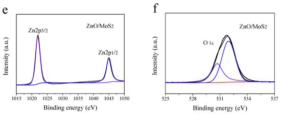 XPS spectra of the MoS2 nanomaterial: (a) Mo 3d and (b) S 2p; XPS spectra of the MoS2/ZnO nanomaterials: (c) Mo 3d, (d) S 2p, (e) Zn 2p, and (f) O 1s.