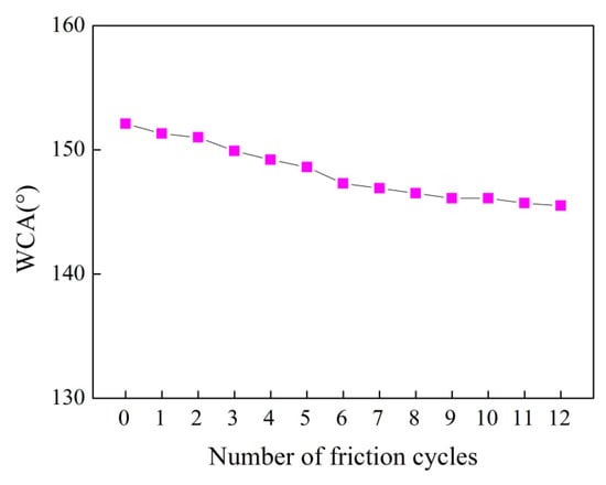 The wear resistance of the coating is shown in the Figure 9. After 7 wear cycles, the CA of the surface of the MoS2/ZnO/PDMS nano-coating decreased to 147.3°. It may be that the nano particles on the surface of the coating were easily rubbed off in the early wear, and the rough structure was slightly damaged in the process of the coating wear. The CA of the MoS2/ZnO/PDMS nanomaterial surface was stable at 145.5°, which indicates that the coating had formed a stable wear-resistant structure, and the MoS2/ZnO/PDMS nanomaterial exhibited wear-resistant properties.
