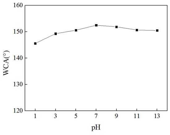 Superhydrophobic coatings may be exposed to various complex environments (such as acid rain) during practical outdoor applications, which degrades the hydrophobicity of the coatings. Therefore, the chemical stability of superhydrophobic coating was studied. The MoS2/ZnO/PDMS nano-coating was immersed in different pH solutions for 30 min, and the CA of the coating surface was measured. As demonstrated in Figure 11, the prepared MoS2/ZnO/PDMS nano-coating had acid and alkali stability. In comparison, the tolerance of the MoS2/ZnO/PDMS nano-coating to acidic conditions was worse than that of alkaline conditions. The reason is that under acid conditions, the surface ZnO in the MoS2/ZnO/PDMS nano-coating will react with acid via a metathesis reaction, destroying the original hydrophobic structure of the coating surface and, thereby, reducing the hydrophobic properties of the MoS2/ZnO/PDMS nano-coating. The acid solution was measured by an atomic fluorescence photometer, which showed that there was Zn in the solution, which also verified that the ZnO reacted with the acid solution.