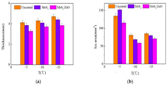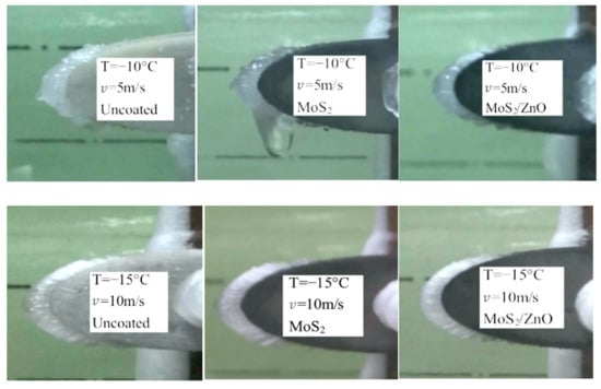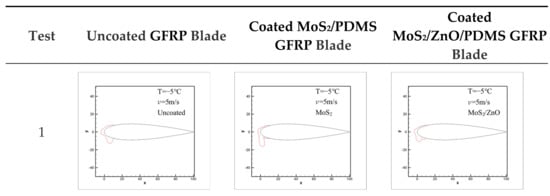 The icing test results for the uncoated GFRP blade, the MoS2/PDMS nanomaterial-coated GFRP blade, and the MoS2/ZnO/PDMS nanomaterial-coated GFRP blade at −10 °C, 5 m/s and −15 °C, 10 m/s for 3 min are shown in Figure 12.