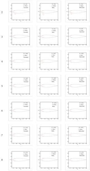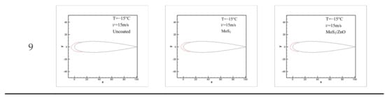 A blade surface icing contour map was generated for each of the uncoated GFRP blade, the MoS2/PDMS nanomaterial-coated GFRP blade, and the MoS2/ZnO/PDMS nanomaterial-coated GFRP blade to measure the blade surface icing shape at 3 min using digital processing. As demonstrated in Figure 13, icicles appeared on the lower surface of the leading edge of the blade in tests 1, 2, and 4. This change can be attributed to the difference in thermal conductivity between the ice layer and the GFRP blade. The thermal conductivity of the ice layer was 2.2 W/(m·K), while the thermal conductivity of the GFRP blade was 0.42 W/(m·K). As a result, when the supercooled water droplets were blown to the blade surface at high temperatures or low wind speeds, the time required for the supercooled water droplets to reach the thermal equilibrium between the supercooled water droplets and the blade increased, resulting in the freezing of the supercooled water droplets. Under the combined action of airflow and gravity, the unfrozen water droplets flowed downward and accumulated to form an ice column. In the other tests, when the ambient temperature as low or the wind speed was high, heat transfer was accelerated, and the time required to achieve a heat balance between supercooled water drops and the blade surface was reduced, the time required for freezing was reduced, and no icicle was generated at the leading edge of blade.