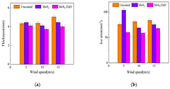 Figure 15 shows the ice thickness and icing area of the leading edge of the blade under the temperature of −10 °C and various wind speeds for 3 min. The results demonstrated that under the same conditions, the icing thickness and icing area of the leading edge of the blade without a hydrophobic coating were larger than those of the blade coated with the MoS2/ZnO/PDMS nanomaterials. The icing thickness of the leading edge of the MoS2/PDMS nanomaterial-coated blade was increased at the wind speed of 5 m/s. This is because at a lower wind speed, the supercooled water droplets were not significantly affected by the airflow after hitting the blade surface, and the ice layer concentrated around the leading edge of the blade. Under the combined action of gravity and superhydrophobic properties, unfrozen water droplets began to flow downward to form icicles. The surface of the blade became irregular, the aerodynamic shape of the blade was damaged, and the thickness of the leading edge of the blade and the icing area of the leading edge increased.