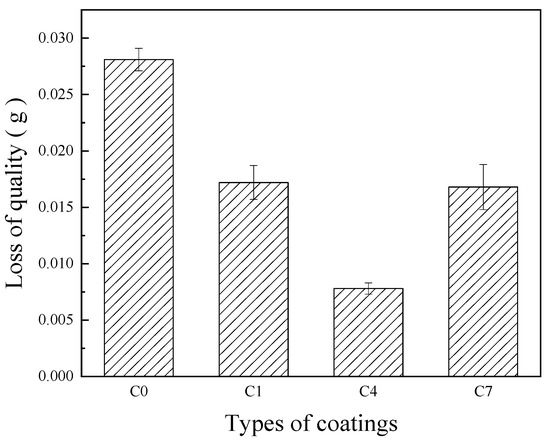 As can be seen from Figure 1, when compared to C0, in which the mass loss was 0.0281 g, the mass losses in the C1, C4, and C7 groups were reduced to 0.0172 g, 0.0078 g, and 0.0168 g, respectively. The better wear resistance of the modified coatings was attributed to the additives (especially the nanoparticles) in the coatings, which promoted the formation of a denser and stronger network structure in the coating. Sun et al. observed a similar result, where nano–boron carbide could enhance the physical and chemical properties of the WPU coatings [30].