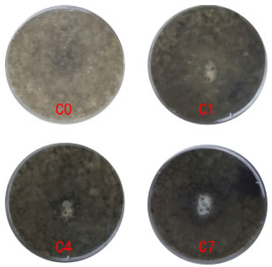 As shown in Figure 2, the specimens in group C0 were thoroughly permeated with mycelium, which demonstrated that the WPU coating itself had no antimildew effect on Aspergillus Niger. In contrast, the modified coatings, including C1, C4, and C7, showed obvious bacteriostatic circles, and the average sizes of the bacteriostatic zones were up to 9.53 mm, 8.43 mm, and 7.17 mm, respectively. Although boric acid/borax was an effective antimildew agent, which has been proven by many researchers [9,31,32,33,34], the leaching performance was still one of the most intractable issues, especially for its outdoor application. In this study, boric acid/borax was introduced into the WPU coating, which was conducive to impeding the leaching process and providing long-term antimildew protection for laminated bamboo. Many researchers have proven that UV1130, nano–TiO2, and nano–SiO2 have an antimildew effect on Aspergillus Niger [35,36,37], which was also proved in our study, and it seemed UV1130 had better performance than the others.