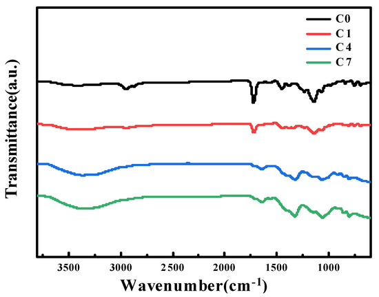 The results of the FTIR spectra taken from the WPU coatings with or without modifications in the range of 4000–500 cm–1 are displayed in Figure 4. All of these coatings had a weak broad peak at 3376.7 cm–1, which should be the N–H stretching vibration in the amide bond group –NHCOO– in the urea group [44] and a notable increase in the intensities in the coatings modified by nano–SiO2 or nano–TiO2 ultraviolet absorbent was observed. The result indicates that the nanoparticles had dispersed into the WPU coating during the drying process, which led to more N–H stretching vibrations. Two broad peaks with low intensities at 2932.7 cm–1 and 2872.7 cm–1 are associated with the symmetric and antisymmetric stretching vibrations of methylene –CH2 on the main polymer chain [45], and these were observed clearly in the samples of the C0 group, but weakened (C1) or disappeared (C4, C7) in the modified coatings, possibly due to the addition of the ultraviolet light absorbents, reacting with these functional groups during outdoor exposure. This result was similar to some existing studies [46,47], in which TiO2 and SiO2 promote redox reactions under the condition of photocatalysis and construct C–C bonds through intermolecular formation. The strong absorption peak at 1720 cm–1 is the stretching vibration of C=O in the ester group –COO– contained in the polyurethane [48], the concave peak around 1670.7 cm–1 belongs to the C=O of urea bonded to one NH group of a nearby urea moiety [49], 1143.5 cm–1 is the stretching vibration peak of polyester C–O–C bonds [50], and 1050.7 cm–1 belongs to the N–CO–O symmetry stretching vibration [51]. When compared with the unmodified WPU coating (C0), the absorption peaks of the modified coatings (C1, C2, and C3) were all obviously weakened, which indicated that the ultraviolet absorbents could interact with the C–N, C–O, and C=O bonds in the coating in the curing process, resulting in the change of spectral peak intensity.