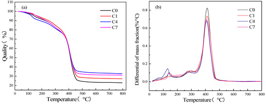 The thermal stability performance of the four WPU coatings with and without modifications was tested by a thermogravimetric analyzer; the TG and the DTG profiles obtained under an inert atmosphere are shown in Figure 5. From the TG profiles, different modifications had obvious effects on the hydrolysis process of the coatings, and the weight loss of C0 was the highest at 77.17%, while the losses of C1, C4, and C7 were 72.81%, 67.27%, and 68.93%, respectively. The reason might be attributed to the boric acid/borax contained in C1, C4, and C7, which had better flame-retardant capabilities and could form a glass-like coating film covered on the surface of the coatings to block the entrance of oxygen and heat at higher temperatures [52,53,54]. Moreover, some researchers have proven that UV absorbents, including nano–SiO2, nano–TiO2, and UV1130, could effectively reduce the pyrolysis of coatings [55,56,57]. Among them, C4 had the best stability, because the network-like nano–TiO2 covering the surface of the carbon layer enhanced the thermal stability of the coating. According to the DTG profiles, there are three obvious weight loss rate peaks for the four coating samples. The first peak appeared around 120 °C, which we attributed to the evaporation of water and moisture in the coatings [58,59], and for which the peak of C4 was the most obvious, maybe because nano–TiO2 is prone to changing the pyrolysis process of WPU coatings at lower pyrolysis temperatures. The second peak showing T around 270 °C was not obvious in all coatings and is attributed to the beginning of the movement of hard segment molecular chains, such as the decomposition of –CH3 and –COOH in WPU coatings. The third peak appeared around 400 °C, in which the pyrolysis rate of each sample reached the highest and was mainly caused by the breakage of the functional groups, such as –RNHCOOR’ and –CO(NH2)2 in the WPU coatings. After 480 °C, the coatings had basically pyrolyzed completely.