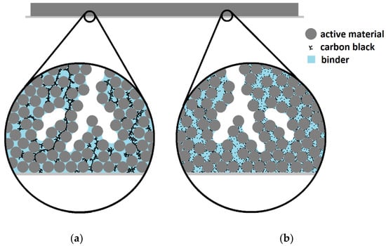 Integrating carbon black into electrodes requires mixing of slurry components using sufficient agitation energy to blend thoroughly while avoiding damage to larger active material particles and facilitating close associations between different particle types [,]. Besides agitation speed, shear forces during slurry mixing are affected by multiple variables, including viscosity and particle characteristics [,]. Differences in rheology, mixing devices and particle dimensions for each electrode production procedure, and the difficulty of estimating shear forces within a slurry during agitation, prevent identifying an ideal range of mixing energy, even for a typical electrode formula. Ineffective electrode slurry mixing can result in a coarse conductive network, either favoring a few long-range paths that bypass regions of active material or inadequately connected short-range paths between electrically isolated regions (Figure 1).