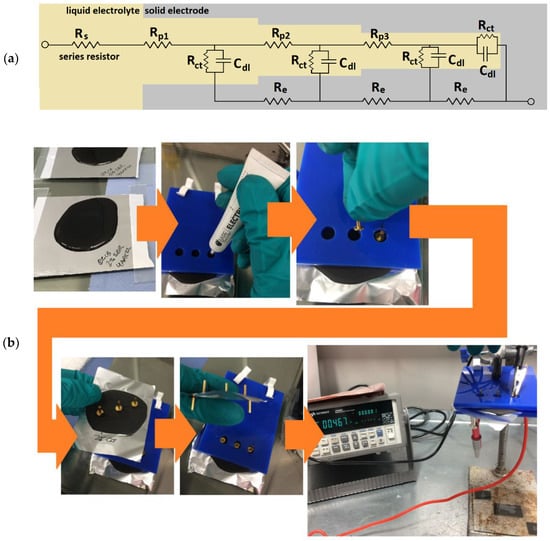 Sample slabs of between 1 and 2 mm thick were produced by pouring approximately 25–50 mL of each sample slurry onto aluminum foil and drying for a minimum of 48 h. The slabs were further prepared by applying conductive paste (Electric Paint, Bare Conductive, London, UK) to attach gold-coated contact pins (Coda Systems Ltd., IPP2-6, Essex, UK) to three points on each upper surface and two points on each current collector. The distances between the points were standardized between samples by using a custom vinyl stencil (Figure 2b).