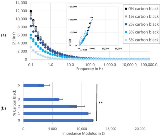 A trend was observed at the low-frequency end of the spectra, where electrodes with more conductive additive demonstrated incrementally lower real and imaginary impedance levels (inset to Figure 3a). Comparing the impedance modulus values further illustrated this link, showing an inverse relation between the percent of carbon black and the maximum |Z| at each frequency (Figure 3a,b). This might be explained by more than one phenomenon related to carbon black, including microstructural changes to pore shapes [], increased electrochemical activity in carbon black surfaces [] and/or increasing active material surface area through binder redistribution []. While each of these variables could affect the performance of anodes in a secondary cell, they obscure the quantification of electronic conductivity as the primary purpose of a conductive additive and of this work.
