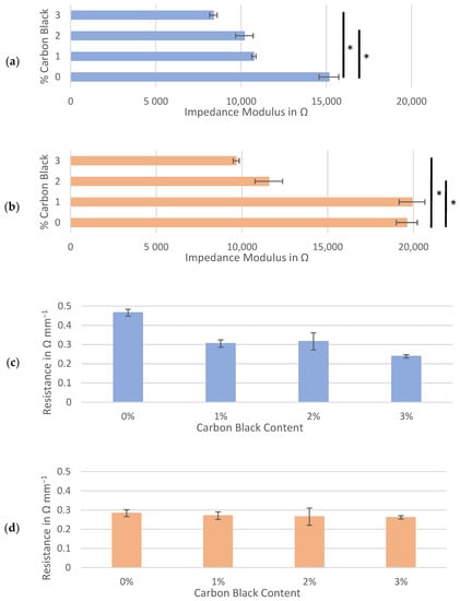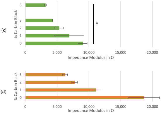 Hard carbon slurries mixed at 3500 rpm: average impedance modulus at 100 kHz for the symmetrical cells composed of (a) Kuranode and (b) MTI hard carbon, and the corresponding through-resistance of the (c) Kuranode and (d) MTI hard carbon. The error bars indicate the standard deviations, and * p < 0.05.