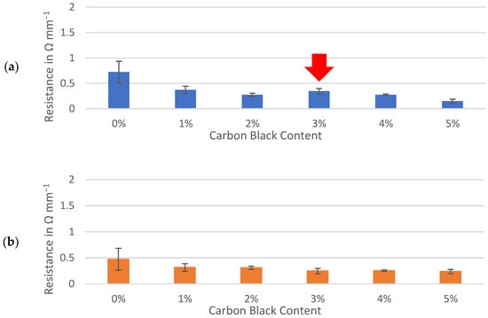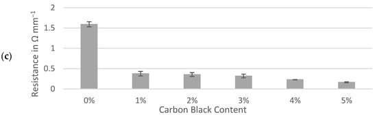 The resistance through the slabs was measured with a multimeter (U3606B, Keysight Technologies, Santa Rosa, CA, USA) used as a two-point ohmmeter. The two-point resistance measured through the electrode slabs was recorded between six possible combinations of upper and lower contacts. For each slab, the average values were normalized to a sample thickness of 1 mm. A minimum of two separate slabs made from slurries mixed on different days were produced for each percent of carbon black in the Kuranode hard carbon slabs. The p-values were determined with a t-test (Excel 365, 2-tailed, 2-sample unequal variance) and compared to 0.05 for statistical significance.