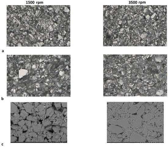 Images of the electrodes absent of carbon black mixed at 1500 rpm and 3500 rpm: (a) Kuranode hard carbon optically magnified 2500×, and (b) MTI hard carbon. SEM images, magnified 2000×, of the (c) MTI hard carbon samples. The scale bar represents 20 µm.