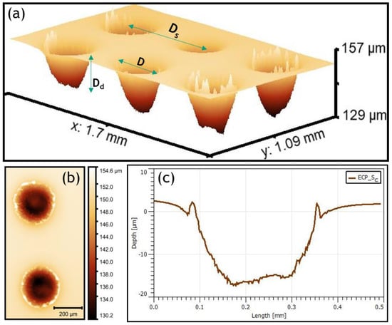 The specimens were polished using SiC abrasive papers from 500 to 2000 Grit and diamond suspension of ~6 μm until a surface roughness Ra lower than ~0.04 μm was obtained and was ultrasonically cleaned with ethanol and acetone (duration 15 min). After cleaning, the specimens were textured using the ECP technique (PMM–Moldes, Maceira, Portugal) with circular (C) geometric patterns. The textured specimens prepared with this ECP technique are named ECP_SC. The surface characterization of the specimen was performed using the interferometer by R-tech instruments, and their texture dimensions were obtained, as shown in Figure 1. Diameter (D) ~262 μm, Dimple depth (Dd) ~19 μm, and the distance between two dimples (Ds) ~306 μm. These dimensions are summarized in Table 2.