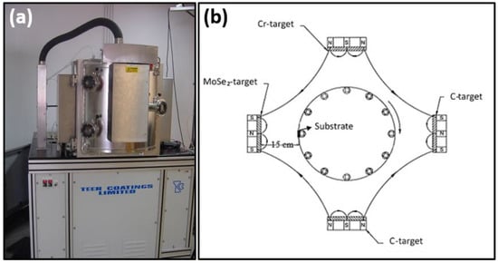 Further, the textured specimens were cleaned to undergo coating deposition. The TMD coating was performed using a closed-field unbalanced magnetron sputtering in a semi-industrial unit (Teer Coatings Ltd., Droitwich, Worcestershire, UK) using MoSeC as the coating material, as shown in Figure 2.