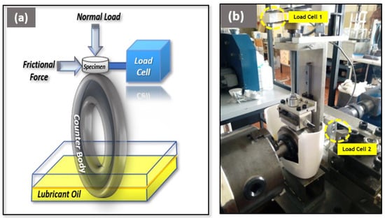 The coefficient of friction (COF) for the prepared specimens was determined using a block-on-ring configuration in an in-house tribometer, as shown in Figure 3. The working principle of this tribometer has already been described in previous works [27].