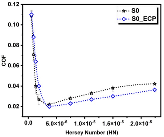 The synergistic effect of the texturing plus coating was studied due to its contribution to improving the frictional properties of the steel specimens at two different lubrication regimes (BL and HL). The tribological behaviour of the circular textured and circular-coated specimens was compared with the smooth and only coated specimen to understand their overall ability. This overall improvement in the tribological behaviour of ECP_SC and ECP_SC_MoSeC specimens confirmed the synergy of surface modification techniques via texturing and coating. Figure 6 shows the Stribeck curves for the specimens S0, S0_MoSeC, ECP_SC, and ECP_SC_MoSeC, and the percentage improvement in the friction level of all these specimens are summarized in Table 8.