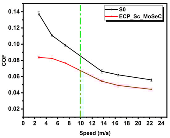 Evolution of the COF with the sliding speed for S0 and ECP_SC_MoSeC specimens (lubricated with PAO 8).