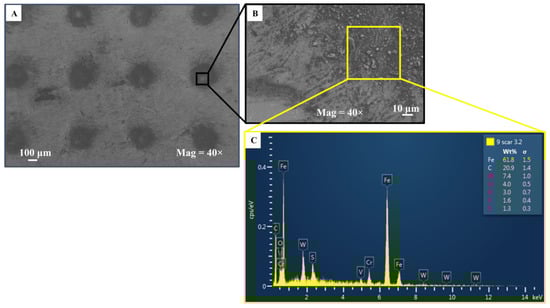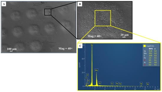 The surface of the ECP_SC_MoSeC specimen was analyzed to check that the traces of the coting contributed to the solid lubrication property of the coating. Figure 11A shows the textured surface of the ECP_SC_MoSeC and Figure 11B shows the magnified texture area, and Figure 11C shows the EDS data at the magnified surface. It was evident that a similar weight percentage of the metallic composition was present at the surface as in the case of S0_MoSeC. However, the coating provided a significant value of the solid lubricant on the material surface, which contributed to the solid contacts at the BL regime. This significantly helped reduce the coefficient of friction values under BL conditions.